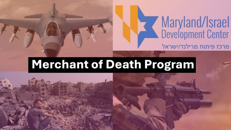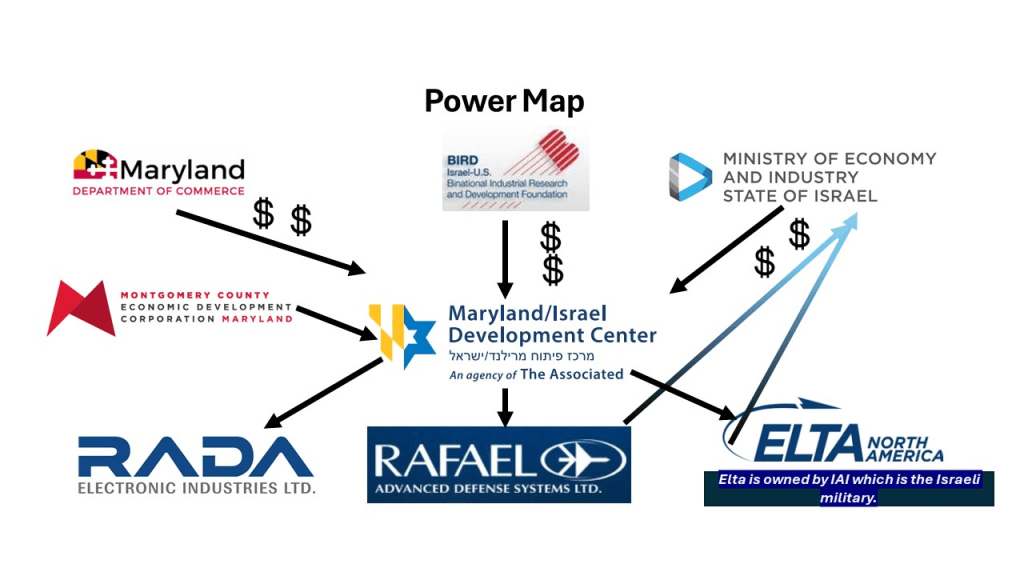 Both the State of Maryland and Montgomery County give grants to the Maryland Israel Development Center (MIDC) to broker partnerships with Israel’s military industrial complex which includes not only Israeli war profiteers but even the Israel military, itself.