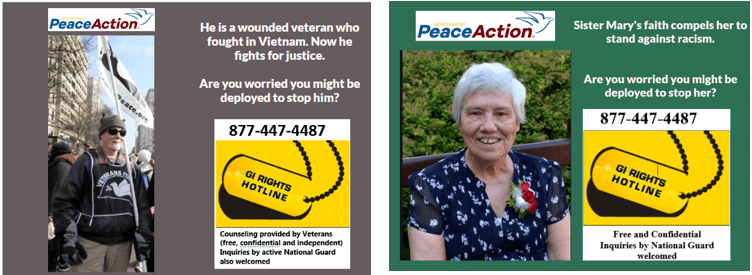 Peace Action Montgomery created a social media campaign with paid ads targeting Maryland National Guard communities about their options. We got a reach of 2,500 readers . Maryland Peace Action and others held a protest at the National Guard Armory in Baltimore and Jean Athey (the Executive Director) got a letter published in the Baltimore Sun.